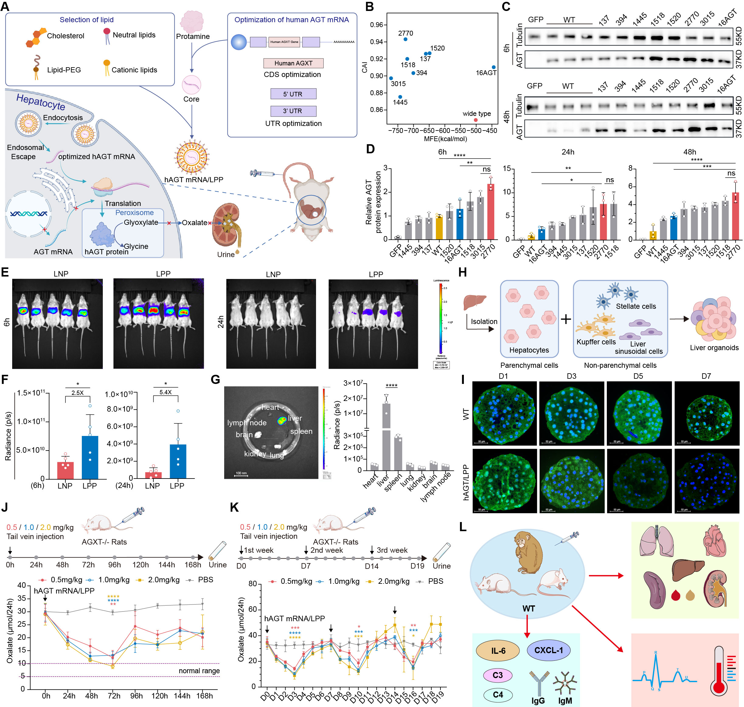 Results: The optimized human AGT mRNA exhibited the highest and most sustained protein expression (B-D). The LPP also demonstrated more persistent mRNA expression (E-F) and effective liver targeting (G). Successful construction of human PH1 liver 3D models, followed by AGT mRNA/LPP transfection, demonstrated a preliminary therapeutic effect (H). PK demonstrated that AGT mRNA and protein maintained high expression levels for up to 48 hours (I). A single 2 mg/kg dose in AgxtQ84-/- rats achieved a 70% reduction in urinary oxalate (J). The combination of AGT mRNA/LPP and oral vitamin B6 had a better effect on reducing oxalate concentration. Also, AGT mRNA/LPP rapidly reduced the urinary oxalate to the baseline value in PH1 rat models with acute onset. Furthermore, weekly multiple doses consistently reduced urinary oxalate in PH1 rats (K). Toxicological assessment in rodents and primates identified the highest non-serious toxic dose (HNSTD) as 2 mg/kg (L).