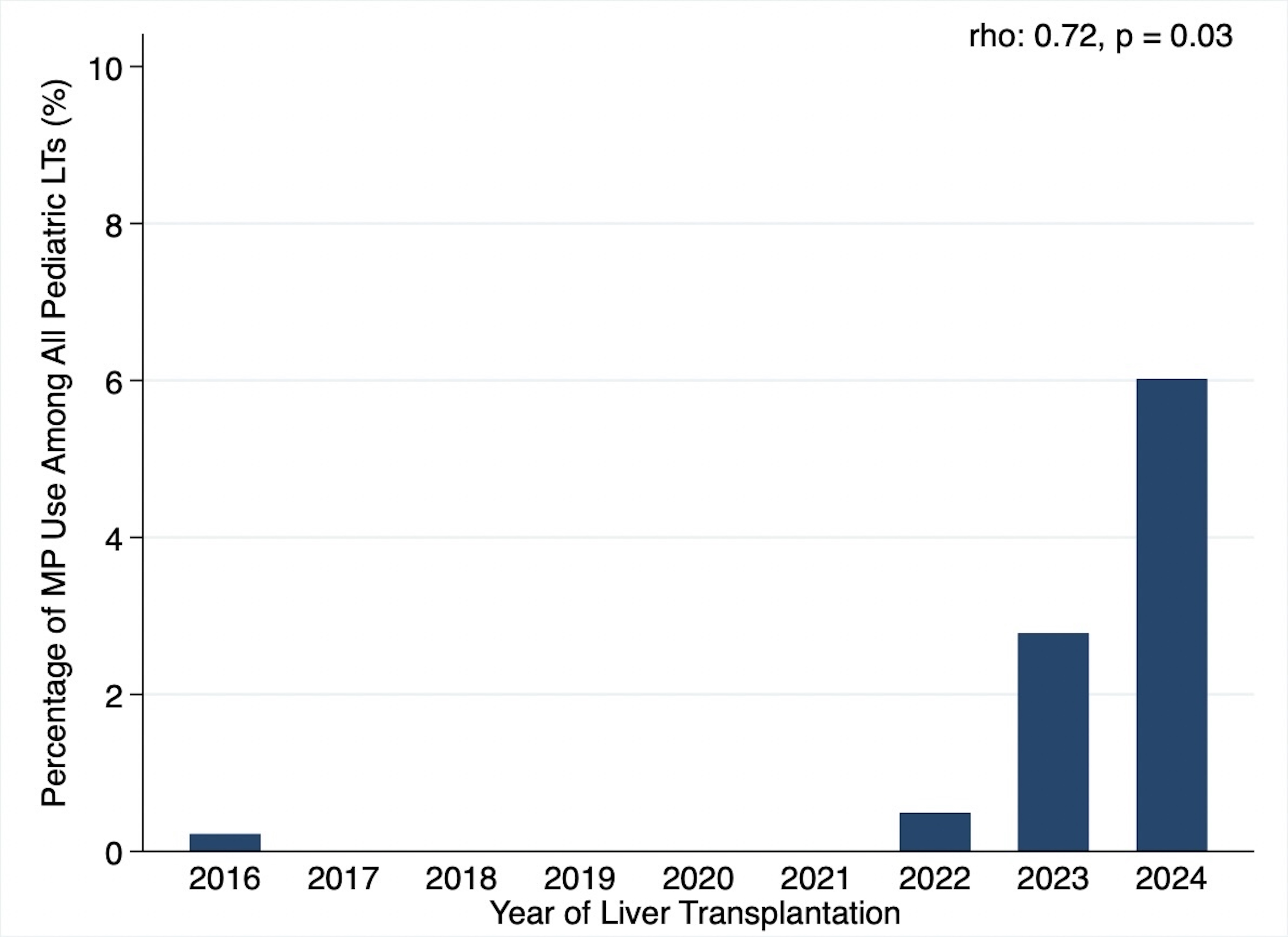 Results: Forty MP pediatric LT recipients were compared to 3,857 non-MP allcomers and 40 non-MP matched recipients. Thirty-seven children underwent normothermic MP (92.5%) and two hypothermic oxygenated MP (5.0%), while for one the type of MP was not available (2.5%). The percentage of pediatric LTs performed using MP significantly increased over time with only 0.2% MP use in 2016 versus 6.0% use in 2024 (rho 0.72, p = 0.03; Figure 1.