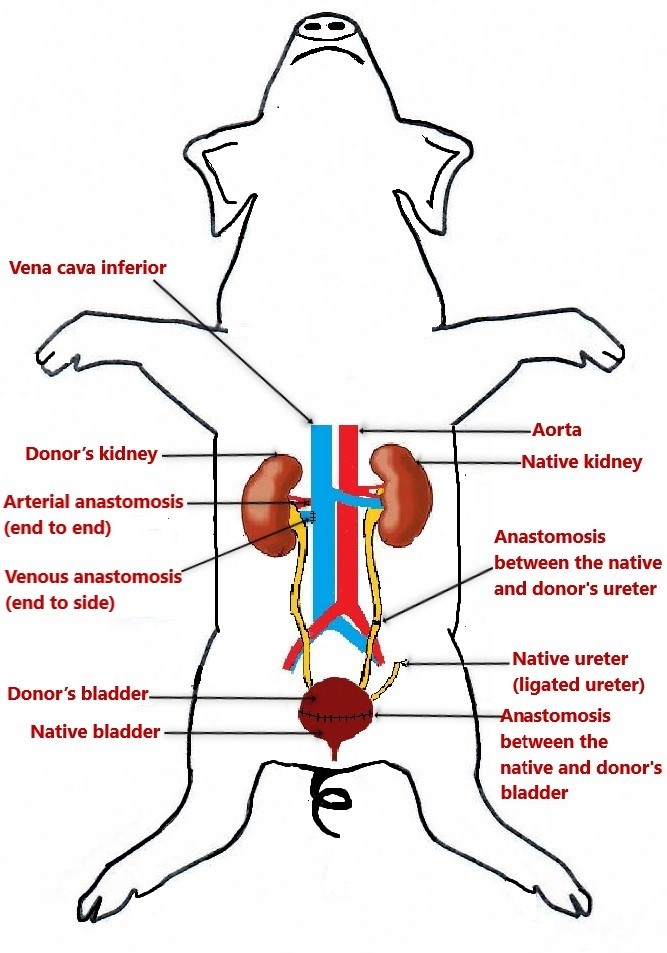 Conclusions: In our experimental model, transplantation of a donor kidney, ureters and part of the bladder to recipients with a simulated microcyst is effectively feasible; pigs are a suitable animal model for genitourinary organ transplantation.