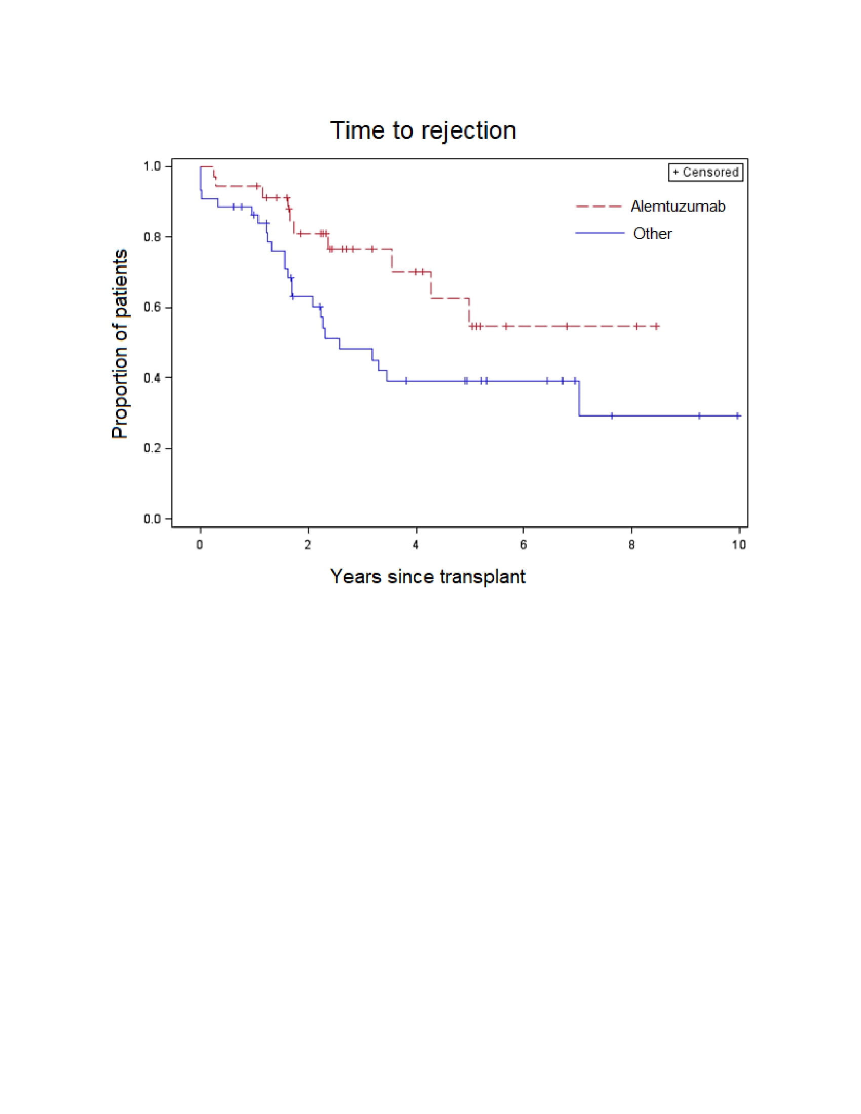 Results: We studied 79 children for a median of 4.94 years (interquartile range [IQR] 2.33, 6.90) of follow-up after kidney transplant. In an unadjusted comparison, there was less rejection over time (p=0.03) among patients who received alemtuzumab (5.7% at 1 year, 45.3% at 5 years) as compared to a combined group of patients who received either basiliximab or thymoglobulin (13.7% at 1 year, 60.9% at 5 years). There were no significant differences in viral infections between induction strategies (Table 1). There was slightly higher risk of neutropenia among alemtuzumab recipients (Table 1) but the difference was not statistically significant.